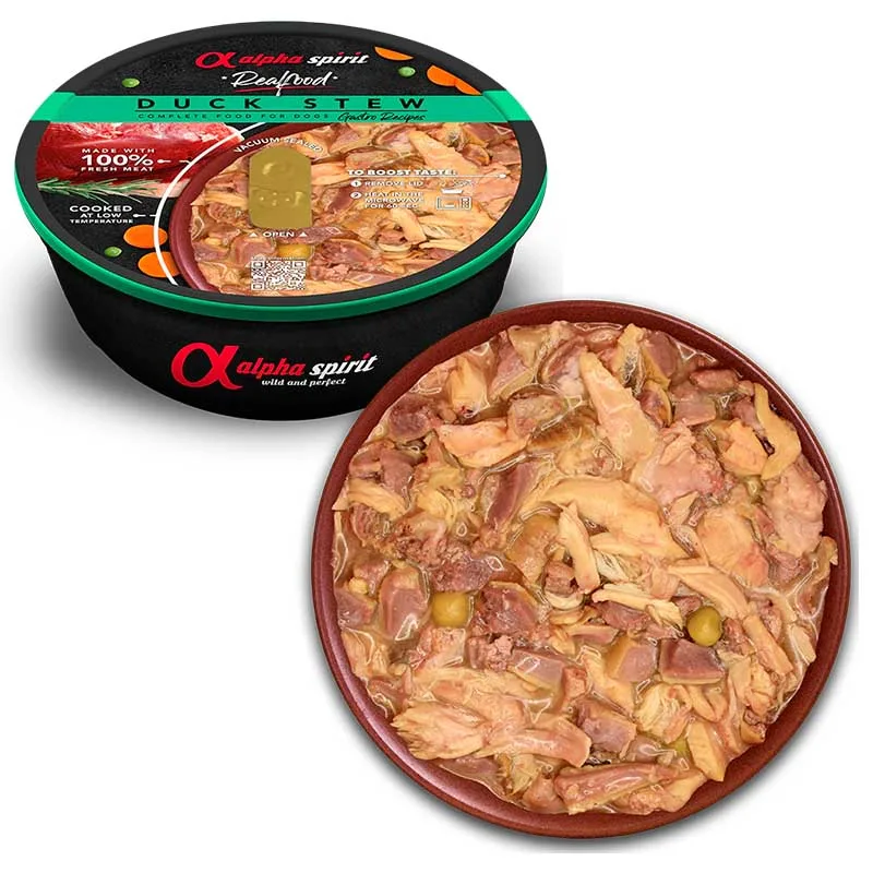 Os Estufados da Alpha Spirit são um alimento húmido completo para cães.