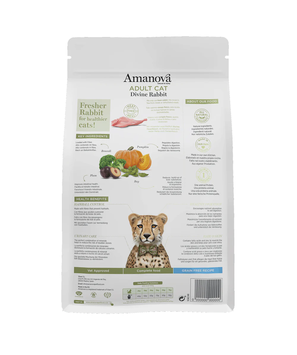 Amanova Adult Cat Divine Rabbit é um alimento sem cereais para gatos adultos a partir dos 12 meses de idade.