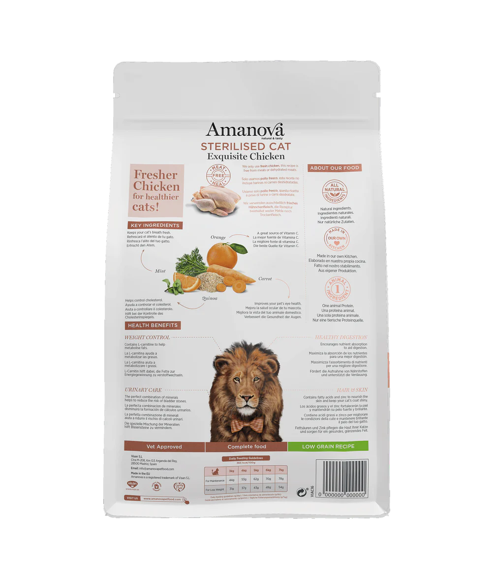 Amanova Sterilized Exquisite Chicken é uma receita exclusiva de ração natural para gatos, sem farinhas de carne ou carnes desidratadas, contém minerais, fibras alimentares e ingredientes especiais como psyllium, probióticos, quinoa e óleo de peixe que ajudarão a melhorar a função renal, a digestão e prevenir o formação de bolas de pelo.