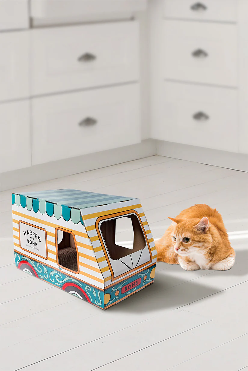 Feita de cartão, esta VAN inclui uma base para arranhar e é muito fácil de construir. Esta House Van para gatos com arranhador é ideal para o seu felino descansar e se divertir ao mesmo tempo.