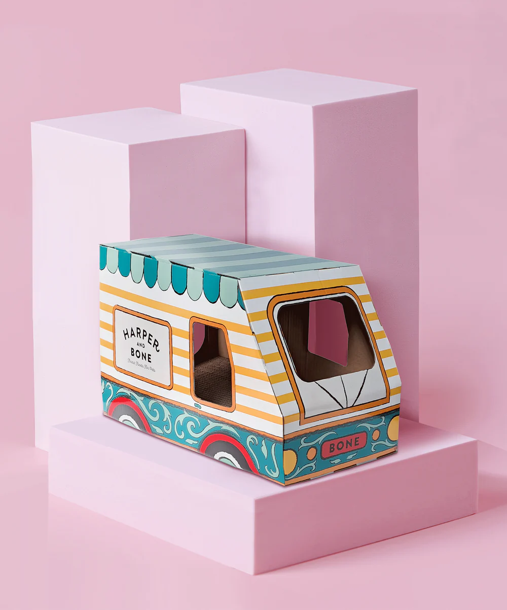 Caixa colorida em forma de carrinha com texto HARPER AND BONE