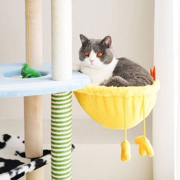 O seu poste alto, revestido com corda resistente e listras, convida o seu gatinho a se esticar e afiar as unhas, ajudando a mantê-las saudáveis e protegendo os seus móveis.