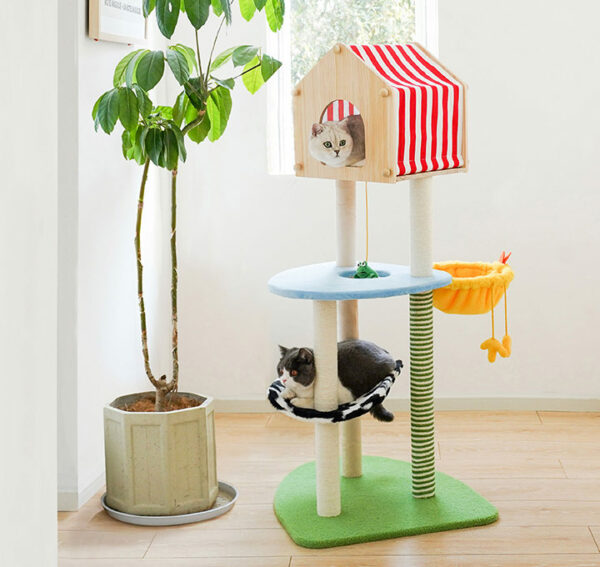 Além disso, incorpora brinquedos pendurados que estimulam seu instinto caçador e o mantêm entretido, e no topo tem uma casinha onde ele pode relaxar depois de brincar.