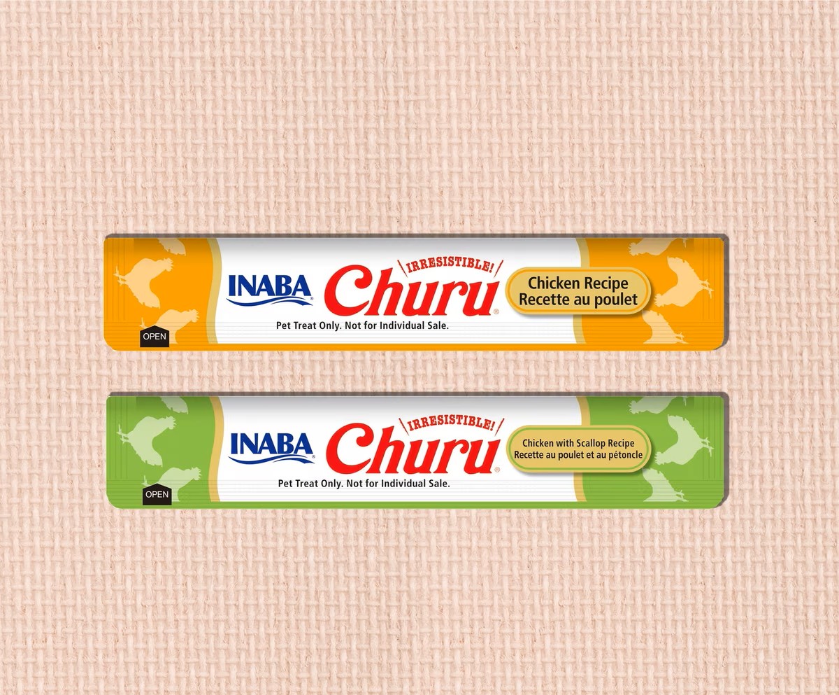 Dois pacotes de petiscos para animais INABA Churu em fundo bege texturado