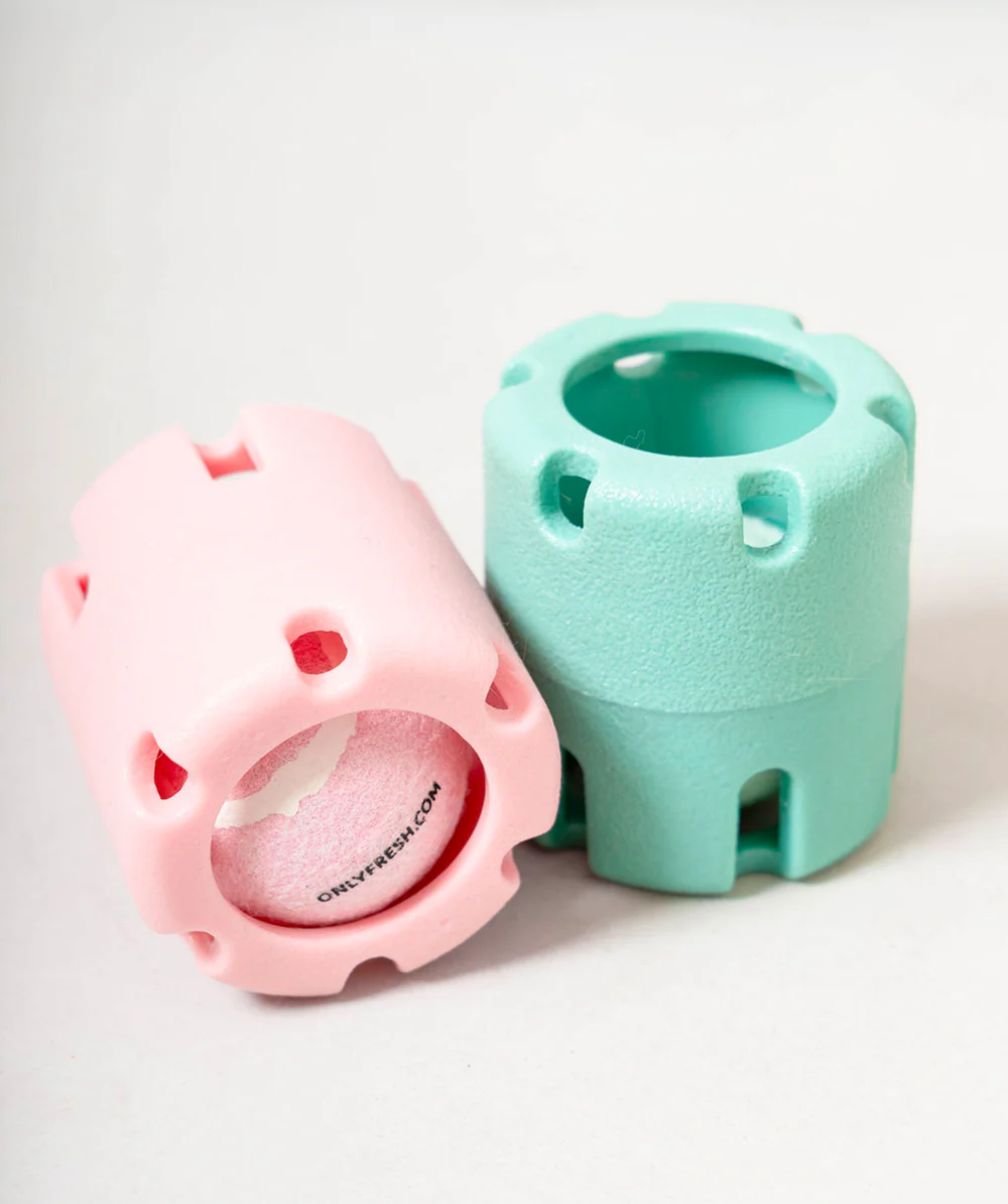 Dispensador verde e bola de ténis verde clara com texto ONLYFRESH.COM sobre suporte branco