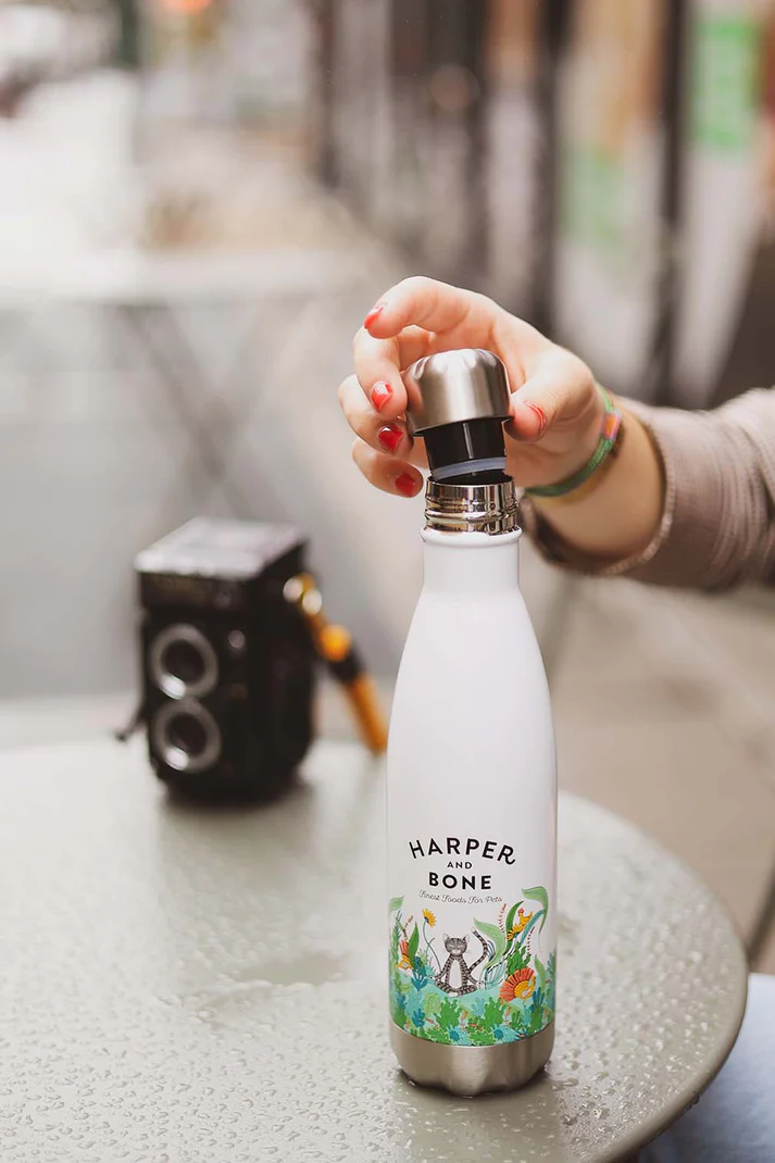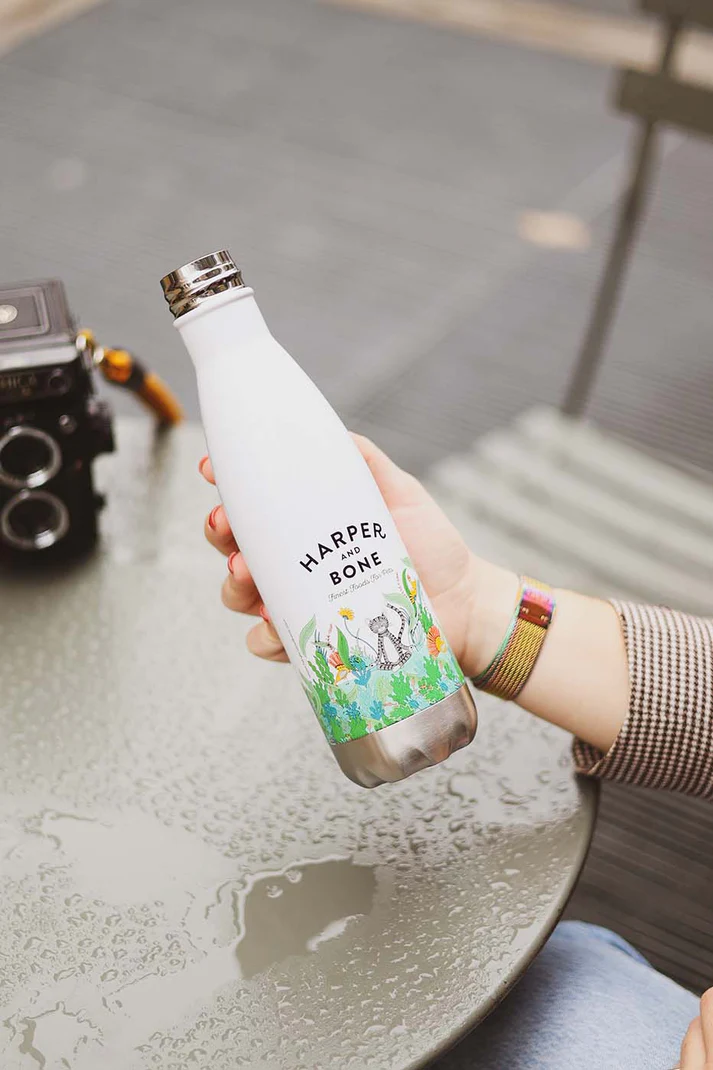 Garrafa térmica branca com decoração colorida e texto HARPER AND BONE na mão sobre mesa metálica molhada