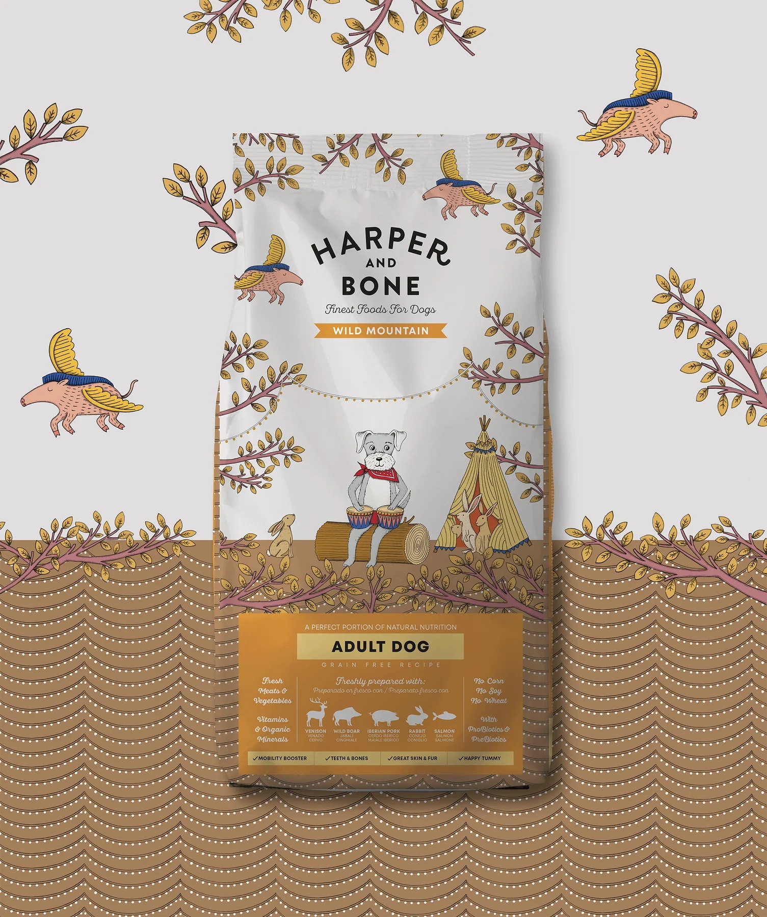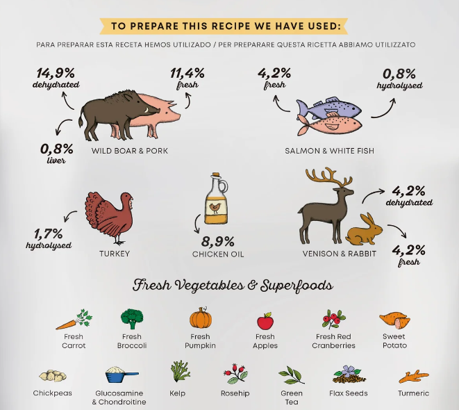Carne de porco ibérico desidratada 14,9%, batata desidratada, óleo de frango (protegido com tocoferóis naturais) 8,9%, ervilhas inteiras, carne de porco ibérico desossada preparada fresca 7,2%, fécula de batata, carne de veado desidratada 4,2%, salmão preparado fresco 4,2%, coelho desossado preparado fresco 4,2%, javali desossado preparado fresco 4,2%, grão de bico inteiro 4,2%, ervilha amarela inteira 4%, fibra de maçã, batata doce desidratada 2,1%, minerais, peru hidrolisado 1,7%, fígado de porco hidrolisado 0,8%, peixe hidrolisado 0,8%, sementes de linhaça (fonte natural de ácidos graxos ω3) 0,6%, polpa de beterraba, fermento (Saccharomyces cerevisiae), brócolo fresco 1.000 mg/kg, abóbora fresca 1.000 mg/kg, maçãs frescas 1.000 mg/kg, cenouras frescas 1.000 mg /kg, glucosamina 1000 mg/kg, condroitina 600 mg/kg, levedura hidrolisada de parede celular (fonte de MOS) 500 mg/kg, chicória (fonte de FOS) 500 mg/kg, extrato de tangerina 400 mg/kg, Yucca schidigera 200 mg/kg, algas marinhas 30 mg/kg, arandos inteiros 30 mg/kg, rosa canina (rica em vitamina C) 30 mg/kg, chá verde 30 mg/kg, açafrão 30 mg/kg.