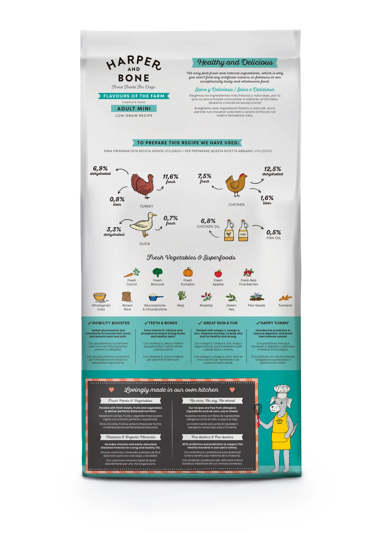 Na mistura incorporámos alguns dos maravilhosos superalimentos que a natureza nos oferece, bem como probióticos saudáveis que promovem a digestão. A nossa receita não está apenas repleta de vitaminas e minerais essenciais, mas também contém condroitina e glucosamina para ajudar a manter bons ossos e articulações. Todos esses fatores combinados proporcionarão ao seu companheiro canino uma dieta perfeitamente equilibrada, e os seus deliciosos sabores da quinta farão com que ele abane o rabo de alegria!