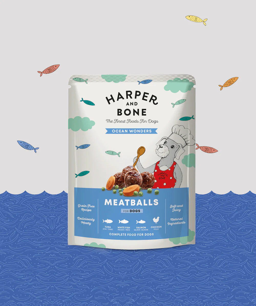 Embalagem de comida húmida para cães Harper and Bone Meatballs com ilustração de cão cozinheiro
