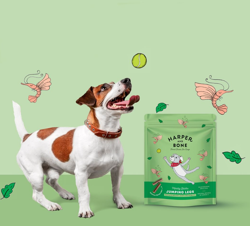 Embalagem verde para snacks de cão Harper and Bone com ilustração de cão e insetos cor-de-rosa