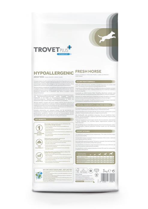 Contém ingredientes cuidadosamente selecionados para minimizar a possibilidade de reações imunológicas (alergia alimentar) ou reações não imunológicas (intolerância alimentar) em forma de problemas cutâneos e/ou gastrointestinais.