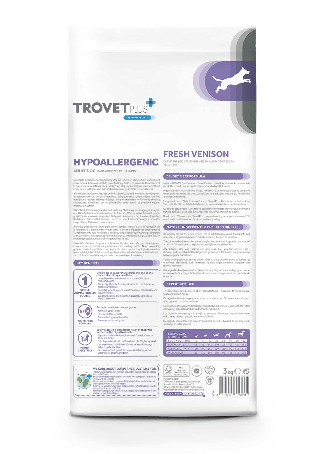 Carne de veado fresca preparada 55% (usamos 93 kg de carne de veado fresca preparada para produzir 100 kg do nosso produto), batata desidratada, óleo de girassol (protegido com tocoferóis naturais), fibra de maçã, leveduras (Saccharomyces cerevisiae), proteína de batata, carbonato de cálcio, fosfato monocálcico, cloreto de sódio, sementes de linhaça (fonte natural de ácidos graxos ω3), vegetais hidrolisados, alga marinha 500 mg/kg, couve desidratada 500 mg/kg, calêndula (rica em carotenos) 100 mg/kg, alecrim 100 mg/kg, chá verde 100 mg/kg.