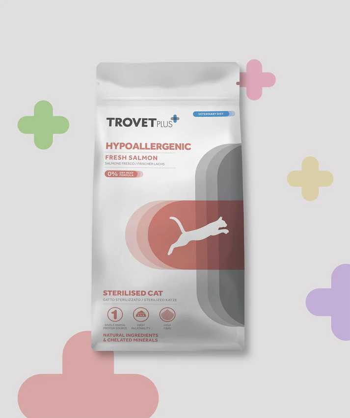 Alimento dietético completo para gatos esterilizados, indicado para a redução da intolerância a ingredientes e nutrientes.